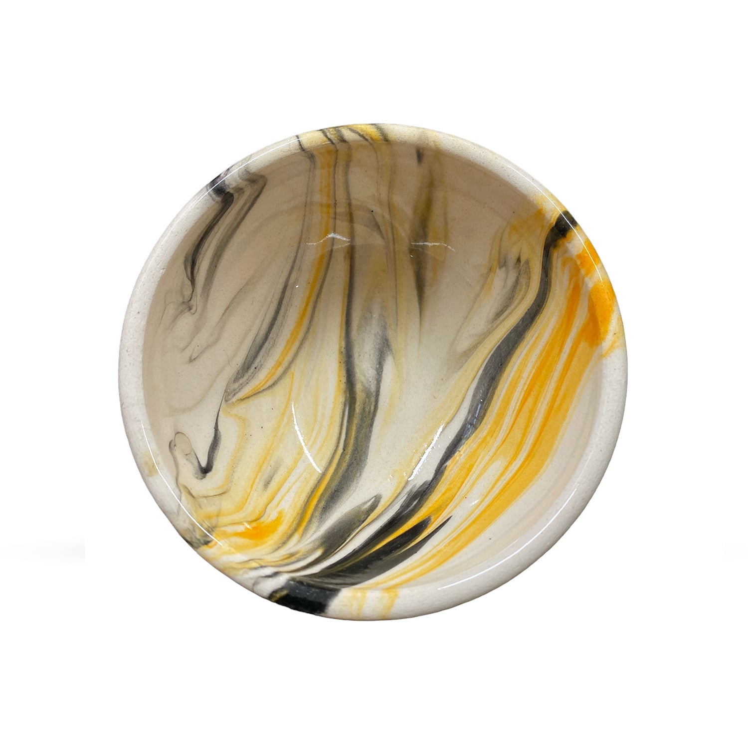 Bascuda Ceramic Dip Bowl, Colonsay | Mocha Series, Yellow Marble in Warm tones of golden yellow and charcoal ripple across an ivory base in a flowing, hand-painted watercolour effect. 8cm x 5cm Depth.