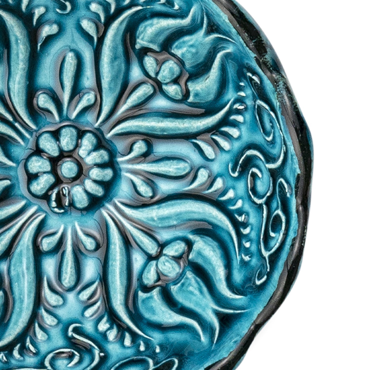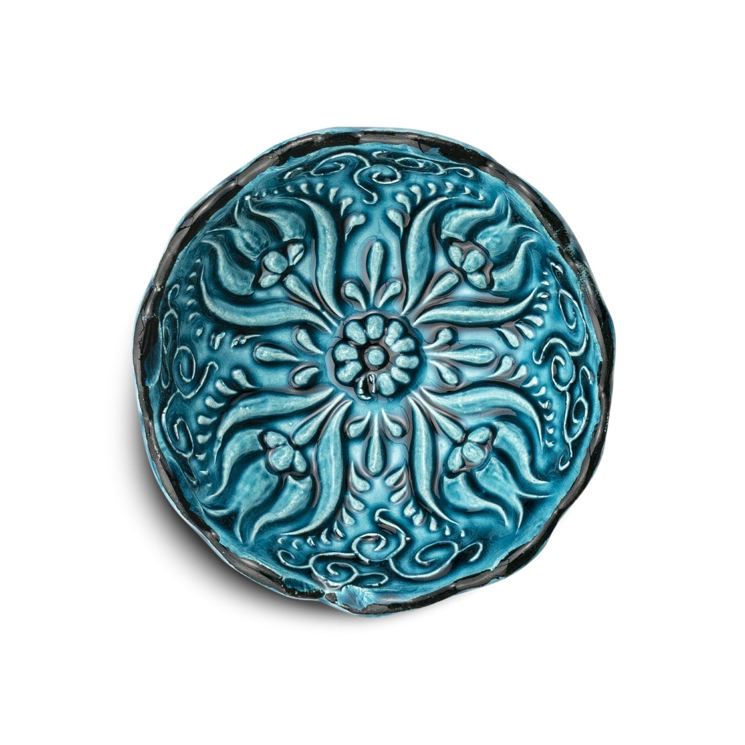 Bascuda Ceramic Dip Bowl, Iznik Series, Turquoise in Glazed in vibrant turquoise with embossed Iznik motifs and a coastal feel. 8cm x 3.5cm Depth.