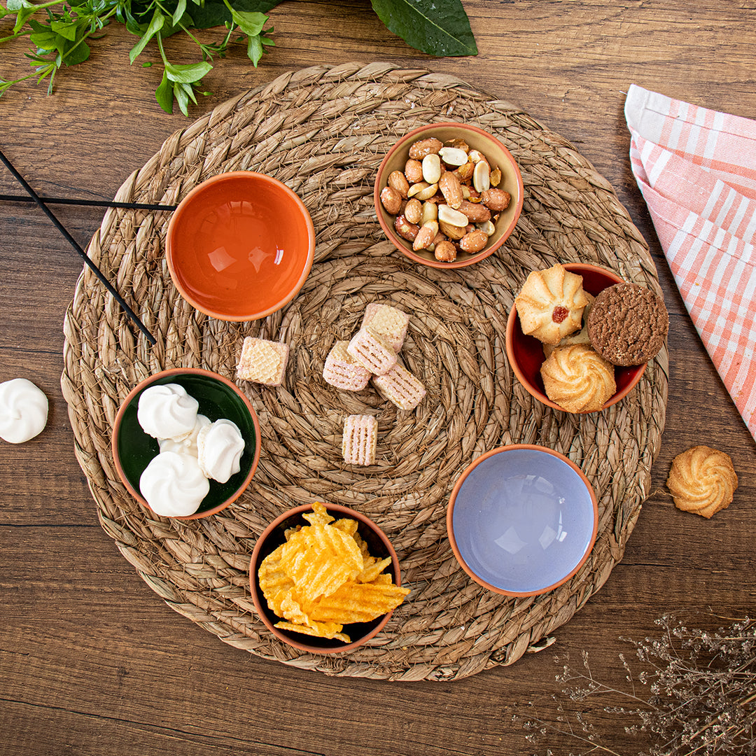 Bascuda Terracotta Dip Bowls, Ruabon Series, Mixed Glazes in Six handcrafted bowls, each glazed in a unique colour—black, red, green, yellow, blue and orange—inside rustic terracotta. 8cm x 3.5cm Depth.